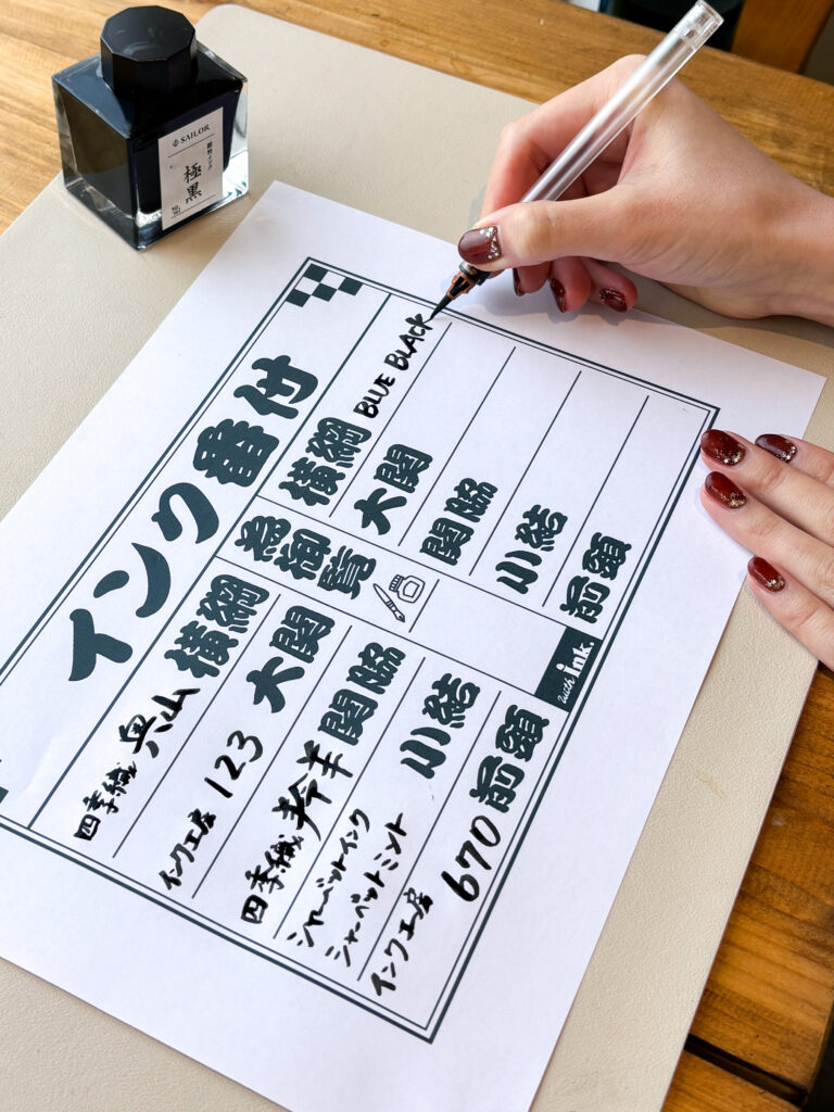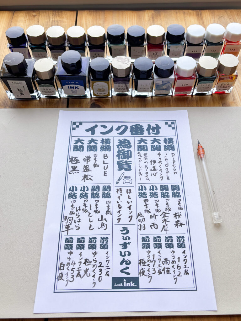 インク番付表は手持ちのインクの色味を比較したり、これから手に入れたいインクをリストアップしたりできるシート です。“横綱級のお気に入り”から“ここぞの一色”まで、整理することでインクの個性がより立体的に見えてきます。