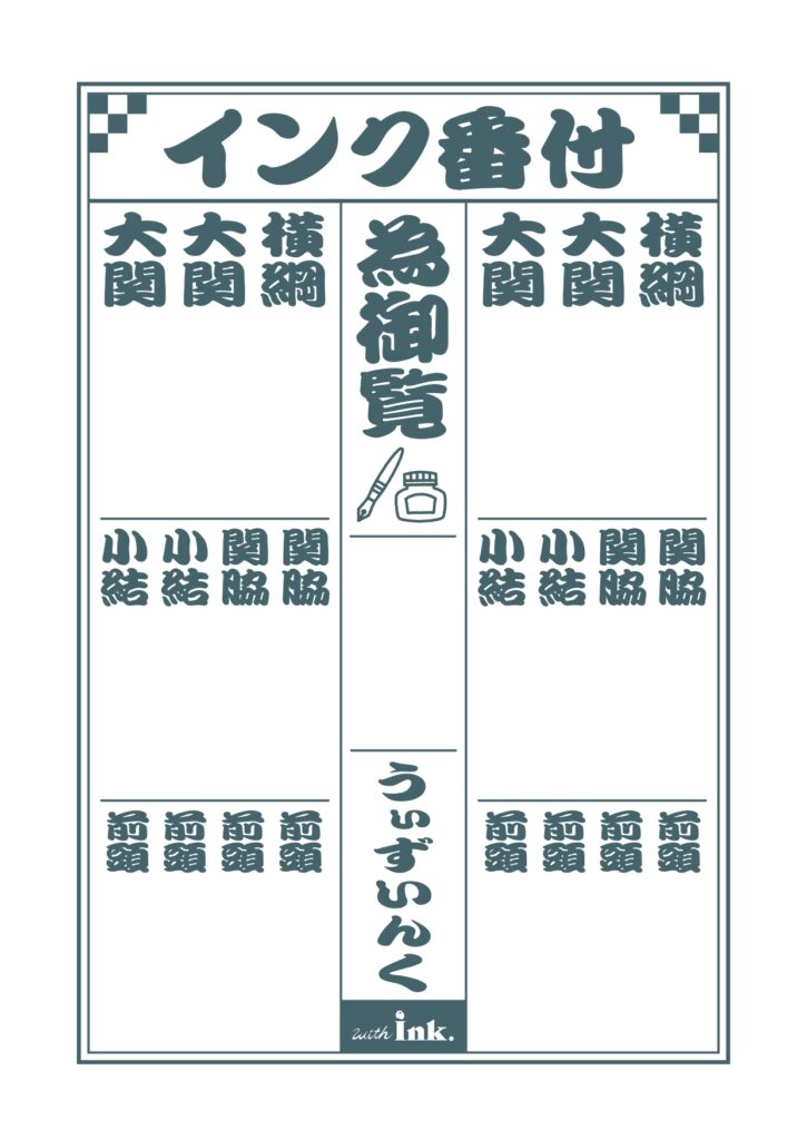 ひとつひとつをもっと愛おしく、楽しく整理できたら――。そんな想いから、with ink.ではオリジナルの『インク番付表』をご用意しました。大相撲の番付表のように“並べて俯瞰する”楽しさをヒントにしたテンプレートです。